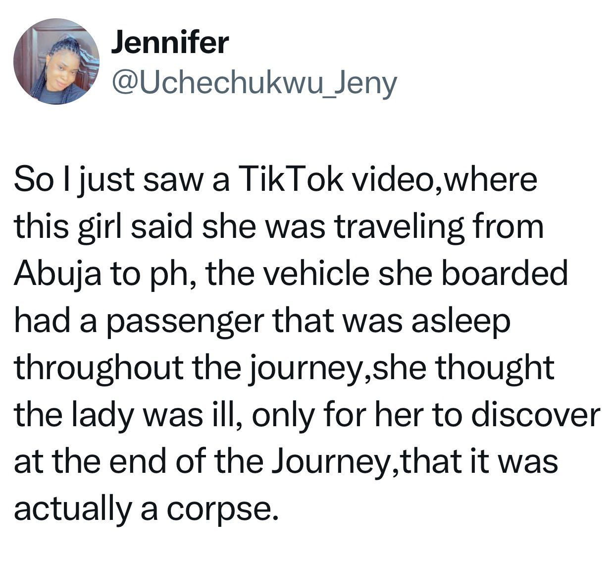 The lady stated that she was traveling from Abuja to Port Harcourt and the vehicle she boarded had a corpse onboard.
