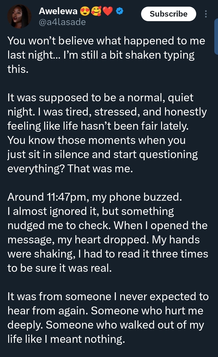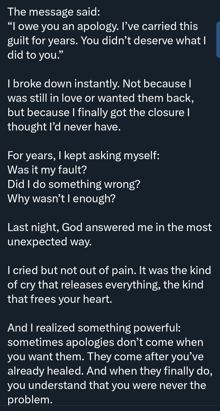 A young lady’s emotional post on X (formerly Twitter) has gone viral, sparking widespread conversations about healing, closure, and unexpected apologies.