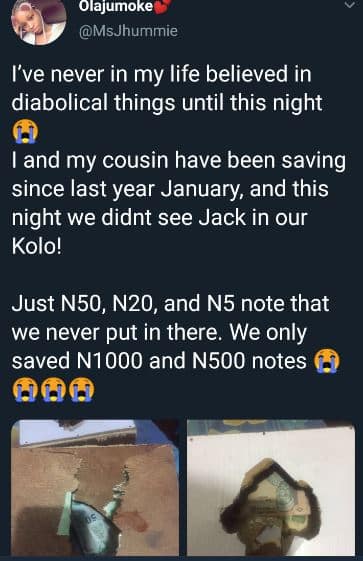 A Nigerian lady was left in shock after she broke her wooden piggy bank locally known as ‘kolo’ to find a sum far lesser than what she believed she put in it.