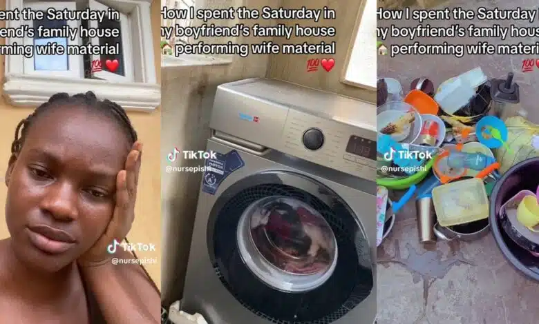 A video featuring a Nigerian lady, showcasing her wife material skills in her boyfriend’s family house by cooking, washing clothes, and doing the dishes, has surfaced on the internet.