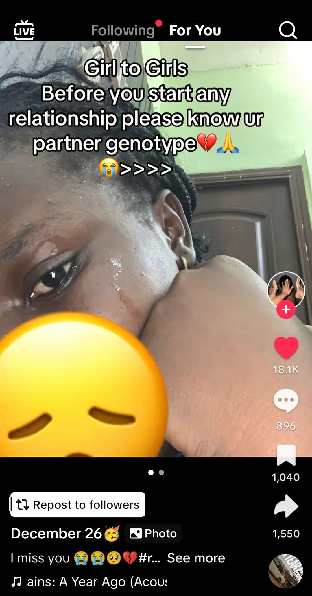 Alongside the images, she issued a warning to women, captioning it, “Girl to girl, before you start any relationship, please know your partner’s genotype.”