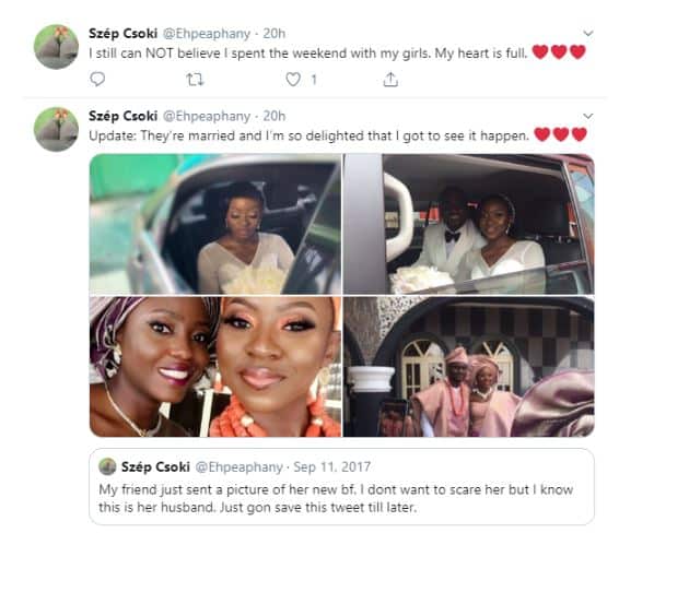 A Twitter user’s tweet of her friend’s boyfriend eventually becoming the friend’s husband has finally come to pass, two years after she shared the tweet.