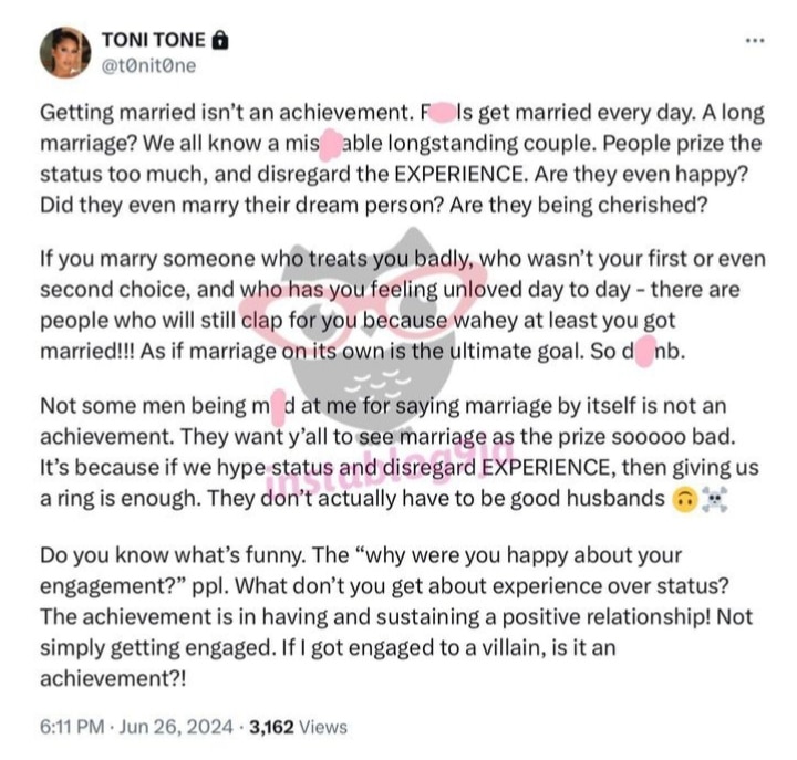 An author, Toni Tone shares her controversial take on marriage as she opines that getting married isn’t an achievement.