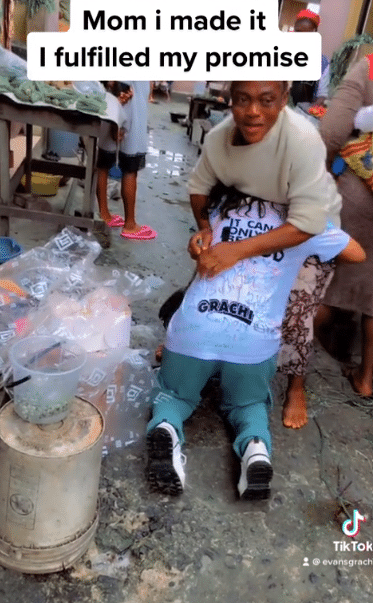 Lady surprises her mother after graduation, rushes to market, and kneels in dirty water before her mom, she signs on her shirt
