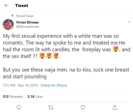 “My first sexual experience with a white man was so romantic. The way he spoke to me and treated me.He had the room lit with candles, the foreplay was ?, and the sex itself ?? ???. But you see these naija men, na to kiss, suck one breast and start pounding.”, she tweeted.