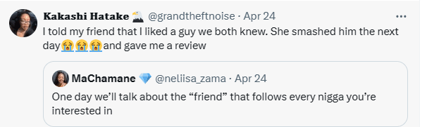 “I told my friend that I liked a guy we both knew. She smashed him the next day😭😭😭and gave me a review”