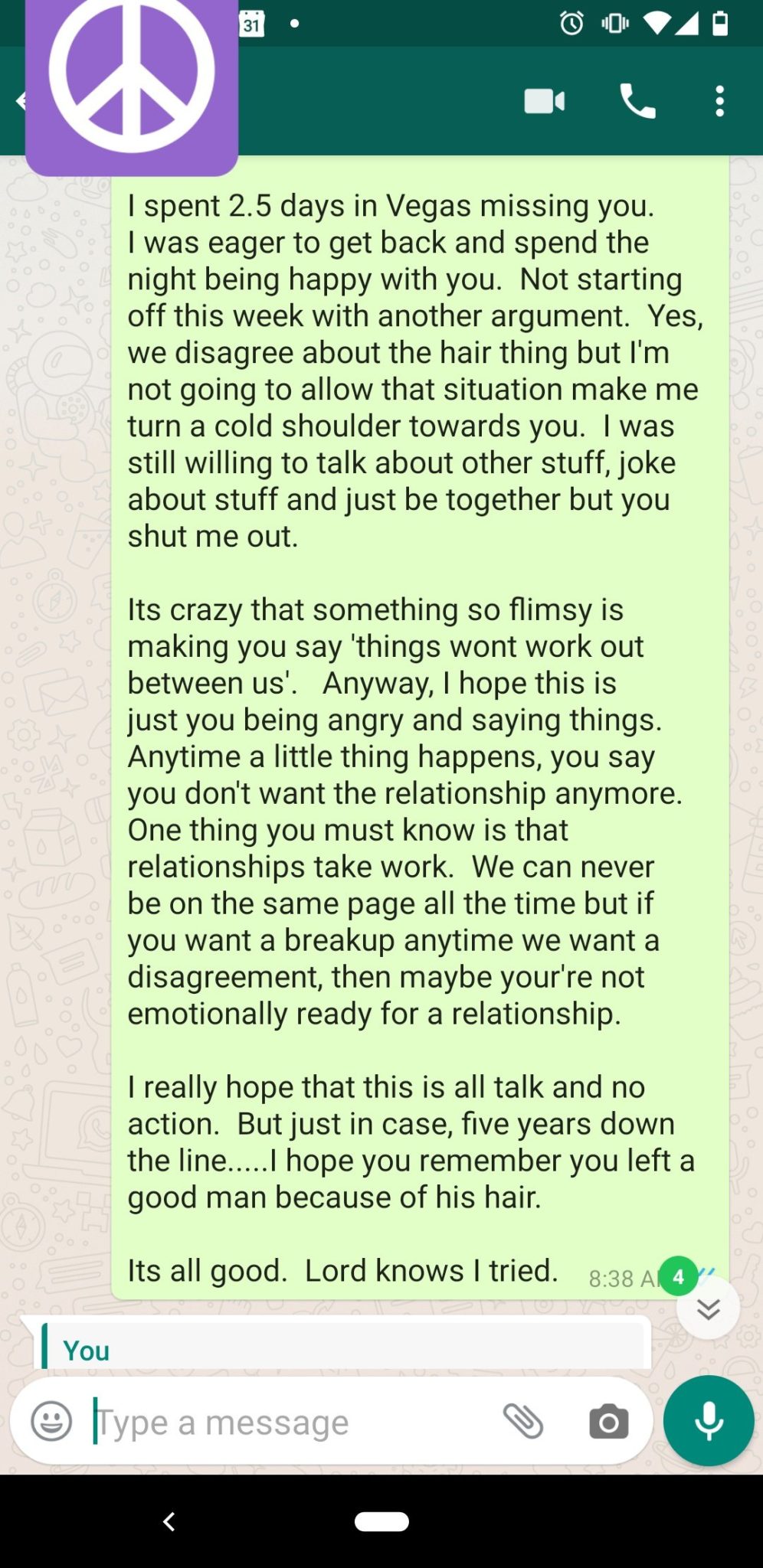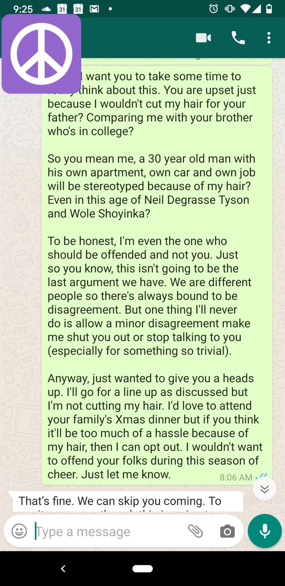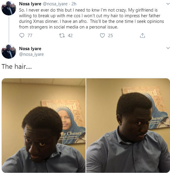 “So. I never ever do this but I need to knw I’m not crazy. My girlfriend is willing to break up with me cos I won’t cut my hair to impress her father during Xmas dinner. I have an afro. This’ll be the one time I seek opinions from strangers in social media on a personal issue.”