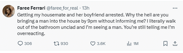 In a post she made on X, she explained that her housemate had invited a man over to their place without informing her.