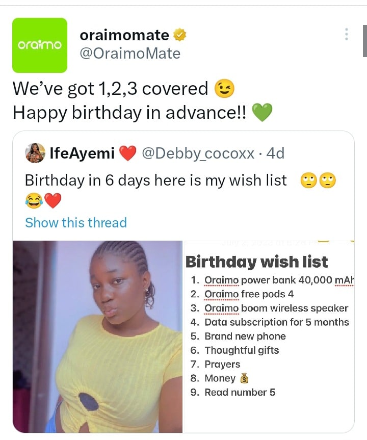 A lucky lady is set to be the owner of a new Oraimo 40k mAh power bank, new set of earbuds and wireless speaker after she publicly shared her birthday wishlist and got a reply from Oraimo.