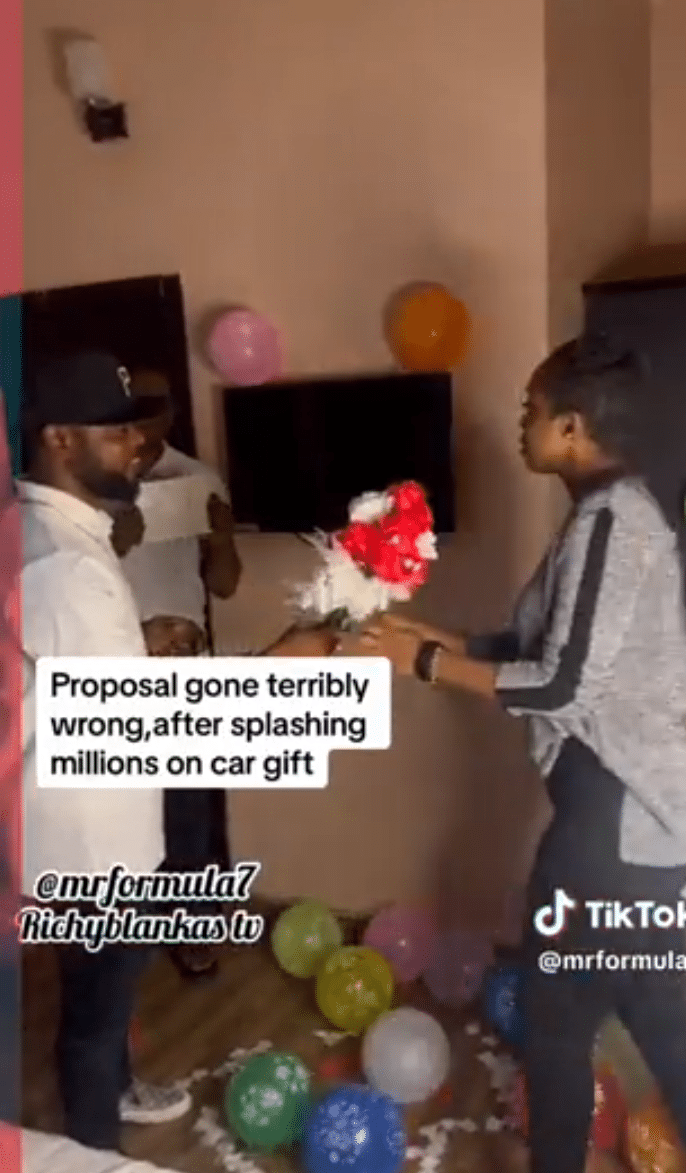 In a social media video, a Nigerian woman declined a marriage proposal from a man suspected to be her boyfriend, despite his extravagant gestures of buying her a brand new car and beautiful gifts.