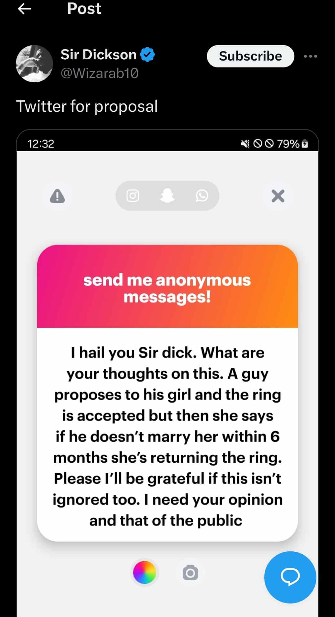 He wrote: “A guy proposes to his girl, and the ring is accepted. But then she says if he doesn’t marry her within six months, she’s returning the ring. Please, I’ll be grateful if this isn’t ignored. I need your opinion and that of the public.”