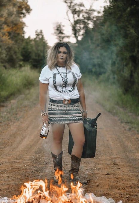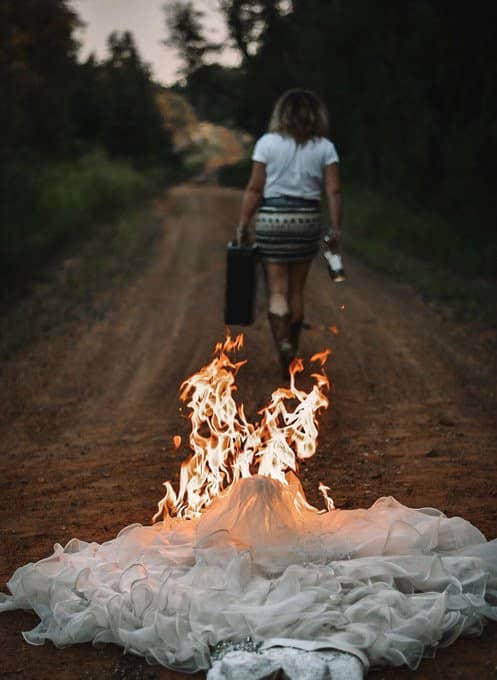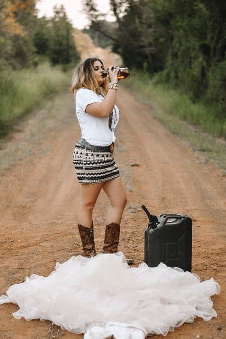 The first picture shows her standing beside her wedding dress and a container of gasoline while drinking from a bottle of whiskey. The next was of her looking straight into the camera and pouring the whiskey on the wedding dress lying on the floor.