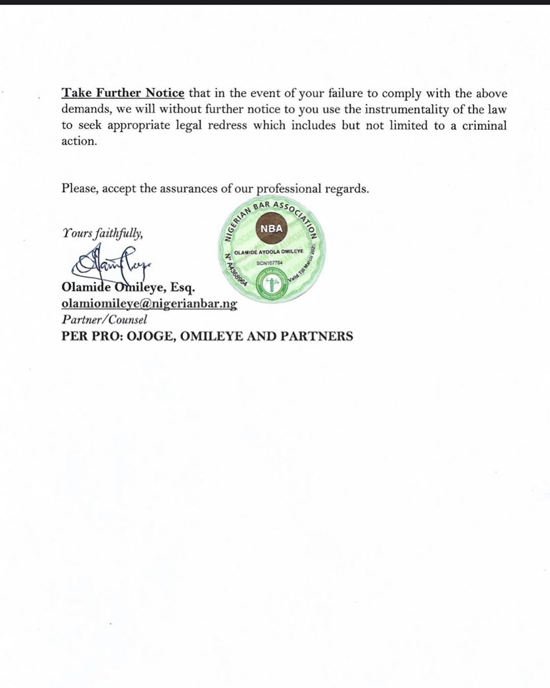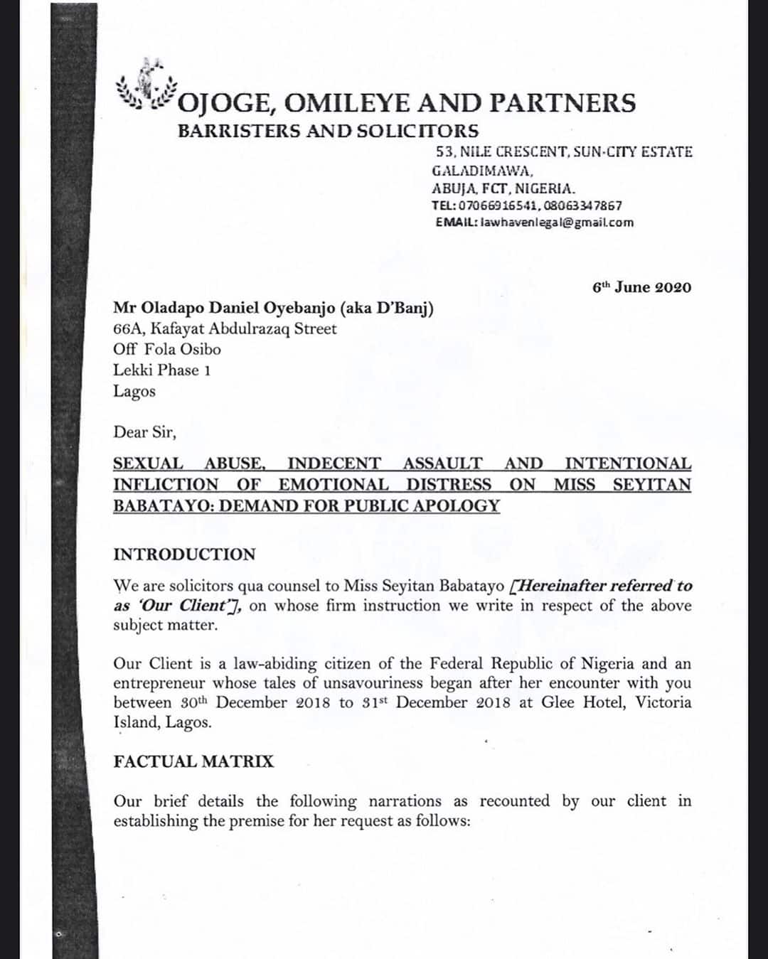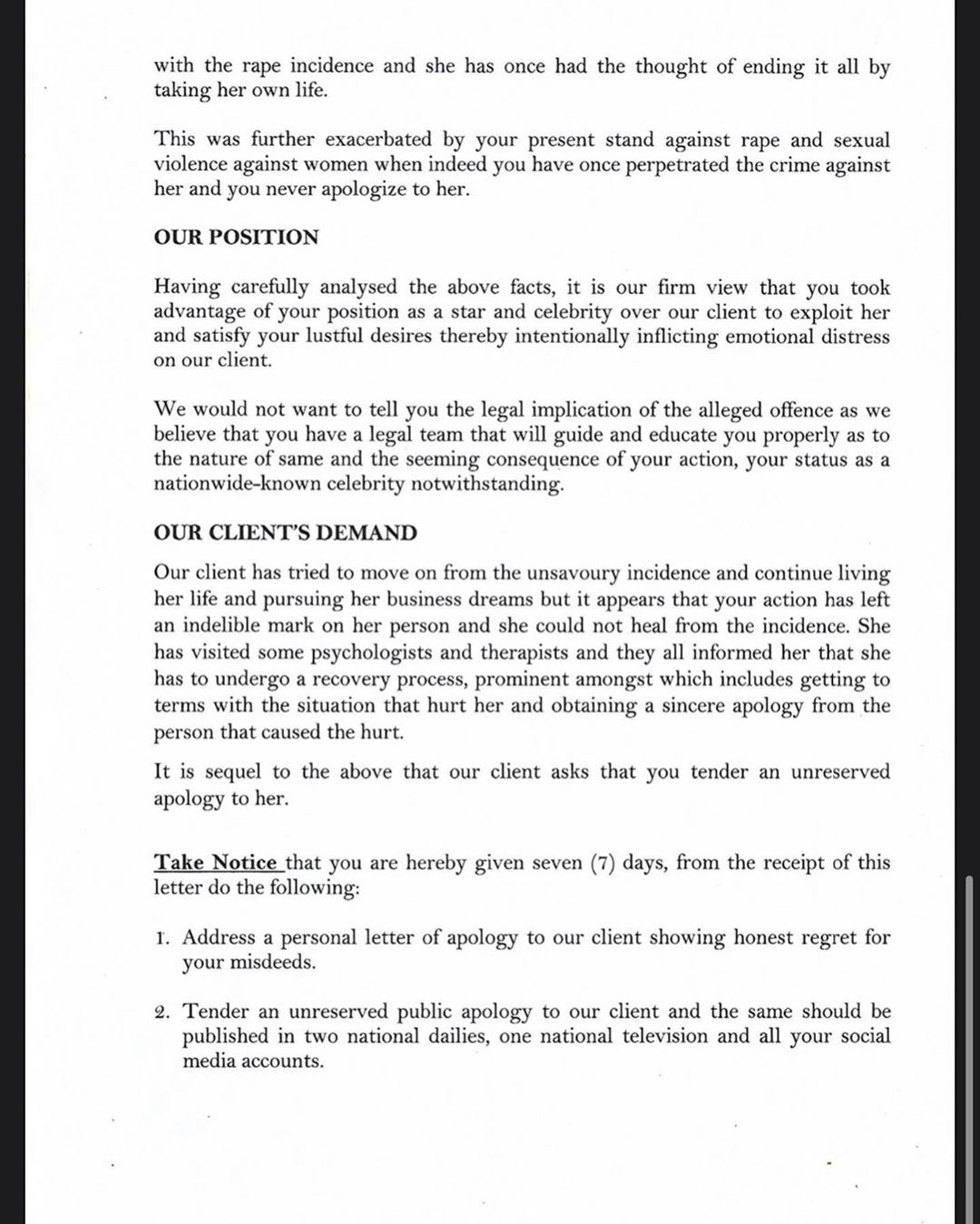 The young lady through her lawyer demanded a private and public apology. She also threatened to institute a criminal charges against Dbanj’ if he does not comply.