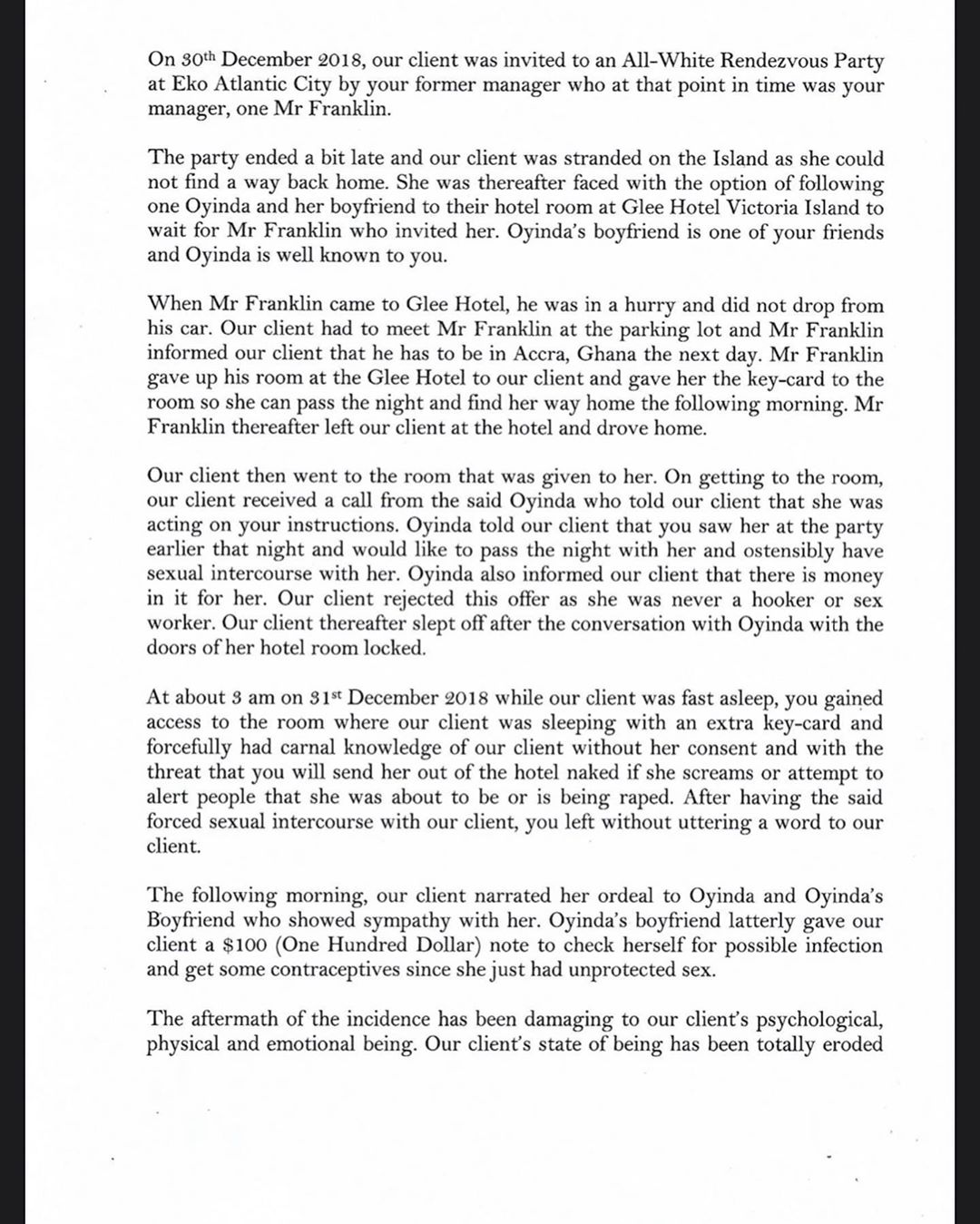 At about 3 am on 31st December 2018 while our client was fast asleep, you gained access to the room where our client was sleeping with an extra key-card and forcefully had canal knowledge of our client without her consent and with the threat that you will send her out of the hotel naked if she screams or attempt to alert people that she was about to be or is being raped. After having the said forced sexual intercourse with our client, you left without uttering a word to our client.