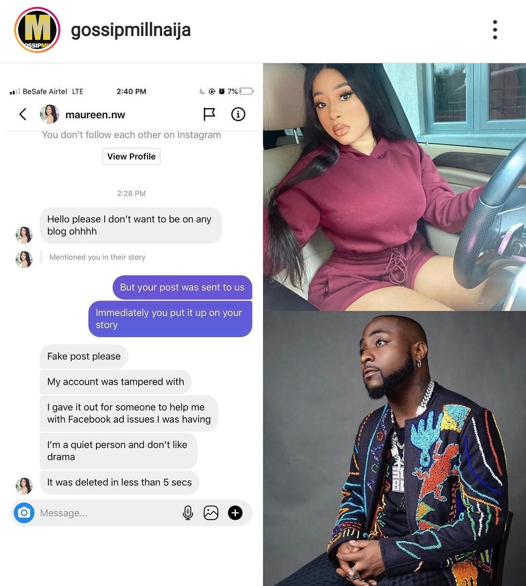 Recall, the lady identified as Maureen shared a screenshot of Davido’s alleged message to her, and asked his fiancee, Chioma to get him out of her DM.