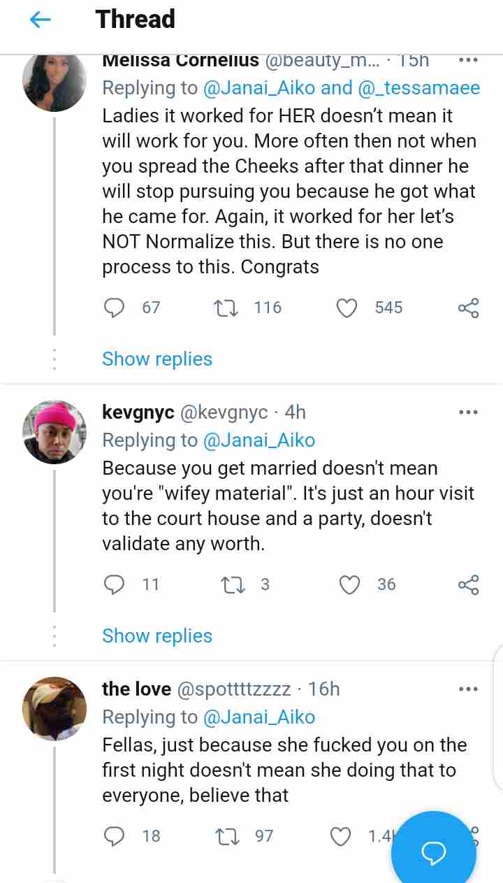 A lady has gone on Twitter to share her own private experience of how she slept with a man on their first date and now are happily married.