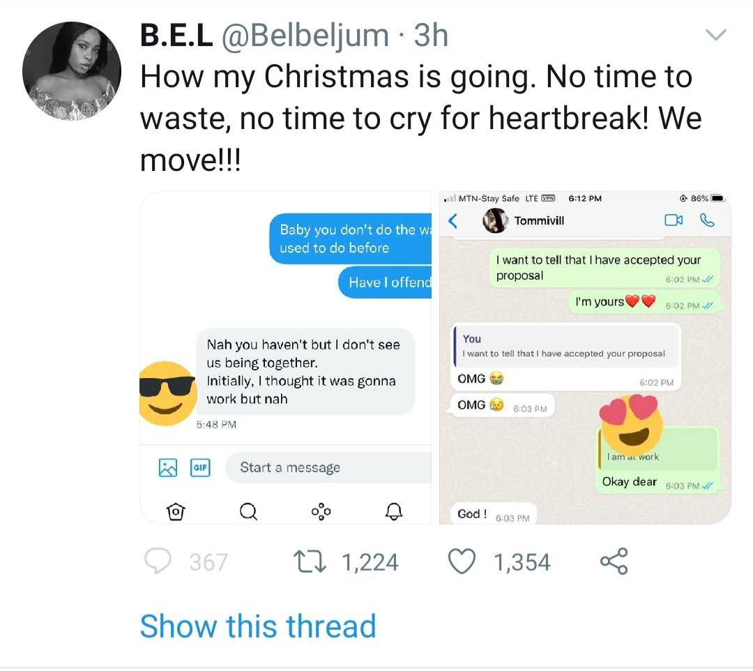 Twitter user identified as @Belbeljum took to the microblogging platform to share how she found another dude a few minutes after her initial boyfriend broke up with her on Christmas day.