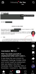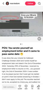 To commemorate her miracle, she wrote: “It was dress like your miracle for Hallelujah Challenge October 2024, and I wrote myself an employment letter dated December 2, 2024. Yesterday, November 29, I received my official employment letter to resume on—you guessed it—the 2nd of December 2024.”