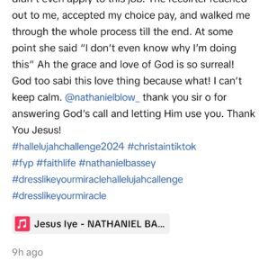 In the video, she revealed that she had prayed with unwavering faith during the October Hallelujah Challenge, asking God for employment. Just weeks later, she received her employment letter.