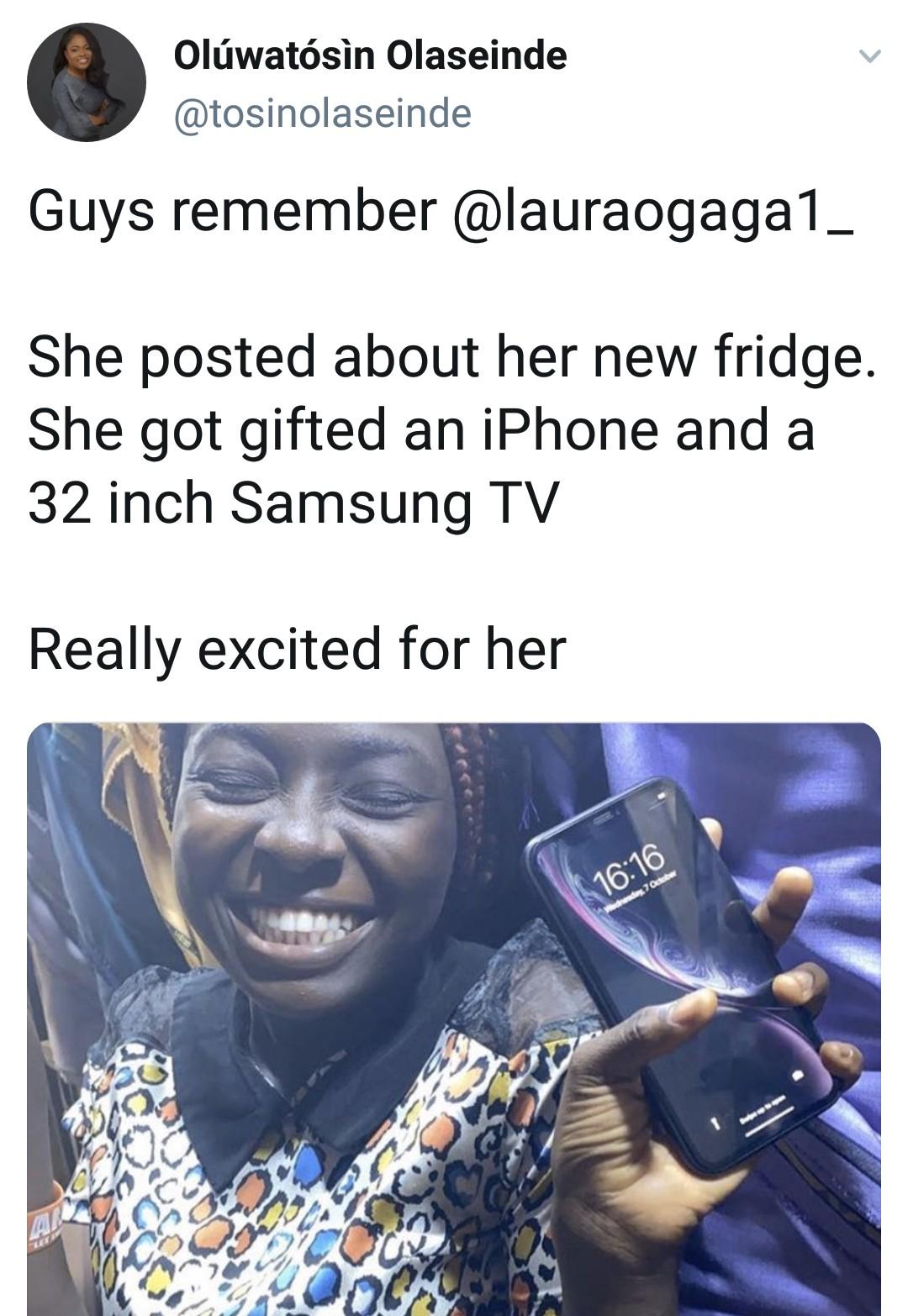 Twitter user, Oluwatosin revealed that Laura was gifted a new TV and an iPhone after she celebrated her fridge on social media.