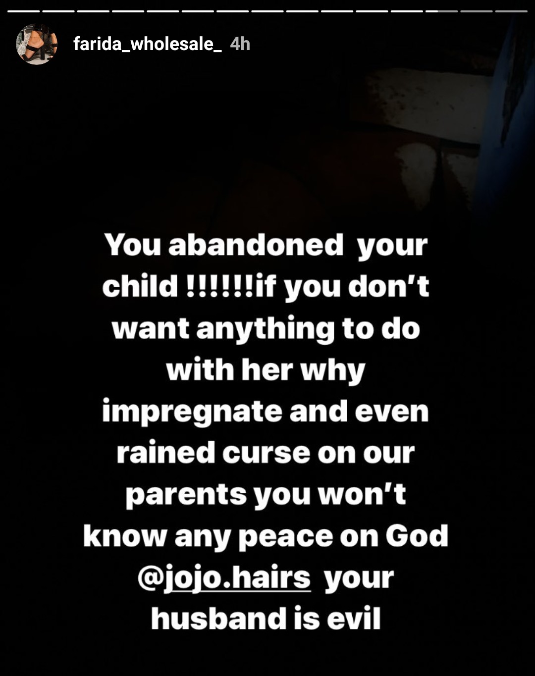 “JoJo your husband is evil. You are insulting me when you know what you did to my sister. You abandoned your child, you don’t want anything to do with her. why impregnate her and even rain curses on our parents. No peace for the wicked. On God you won’t know peace. Na you be…………..”