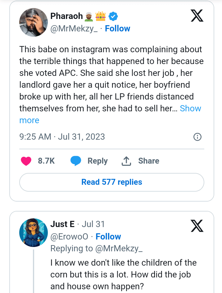 “This babe on instagram was complaining about the terrible things that happened to her because she voted APC. She said she lost her job , her landlord gave her a quit notice, her boyfriend broke up with her, all her LP friends distanced themselves from her, she had to sell her phone to eat cos hunger nearly blinded her.
