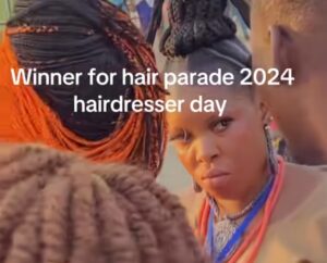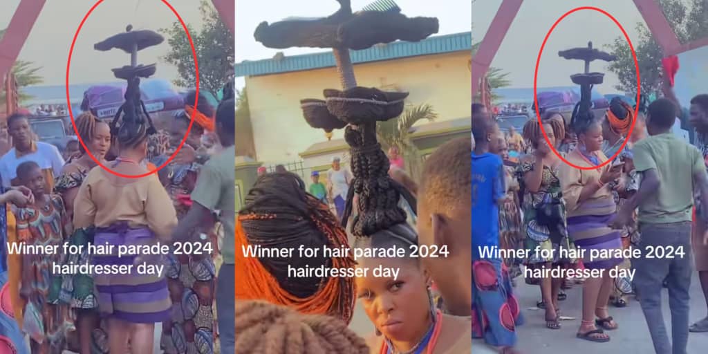 A Nigerian lady has taken the internet by storm after winning a competition on Hairdresser’s Day, thanks to her unique trolley-inspired hairstyle.