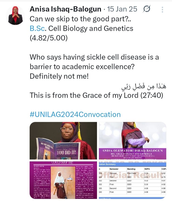 “Can we skip to the good part?.. B.Sc. Cell Biology and Genetics (4.82/5.00). Who says having sickle cell disease is a barrier to academic excellence? Definitely not me!” she tweeted.