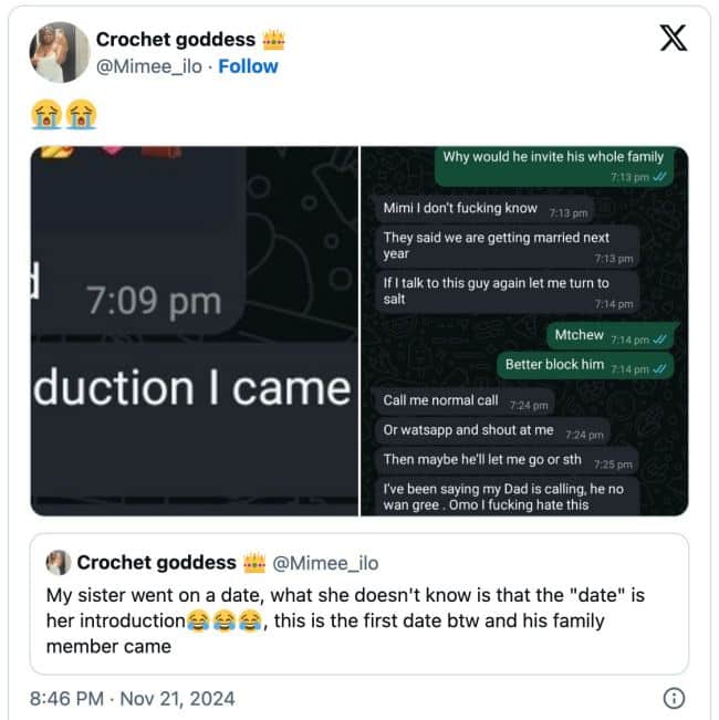 Mimee captioned the post: “My sister went on a date, what she doesn’t know is that the ‘date’ is her introduction. This is the first date, btw, and his family came.”
