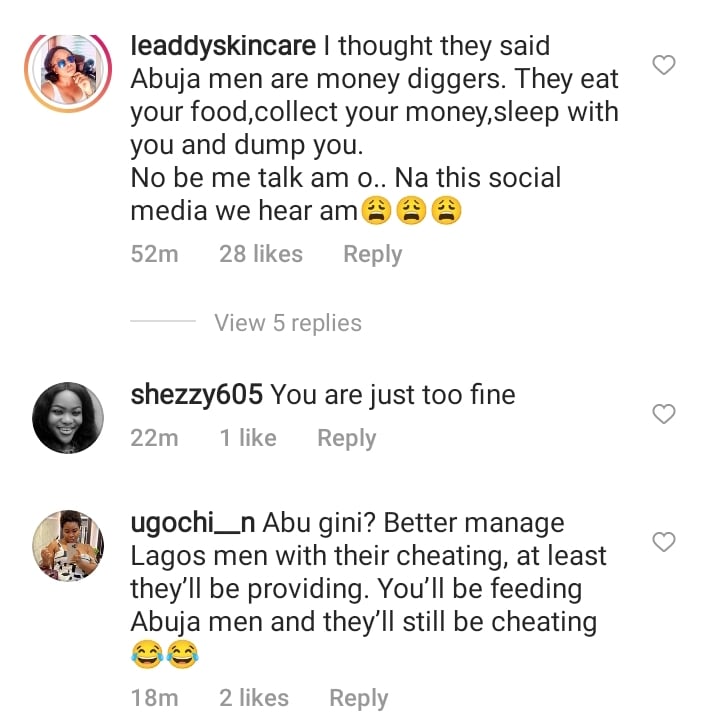 ugochi_n wrote: “Abu gini? Better manage Lagos men with their cheating, at least they’ll be providing. You’ll be feeding Abuja men and they’ll still be cheating”