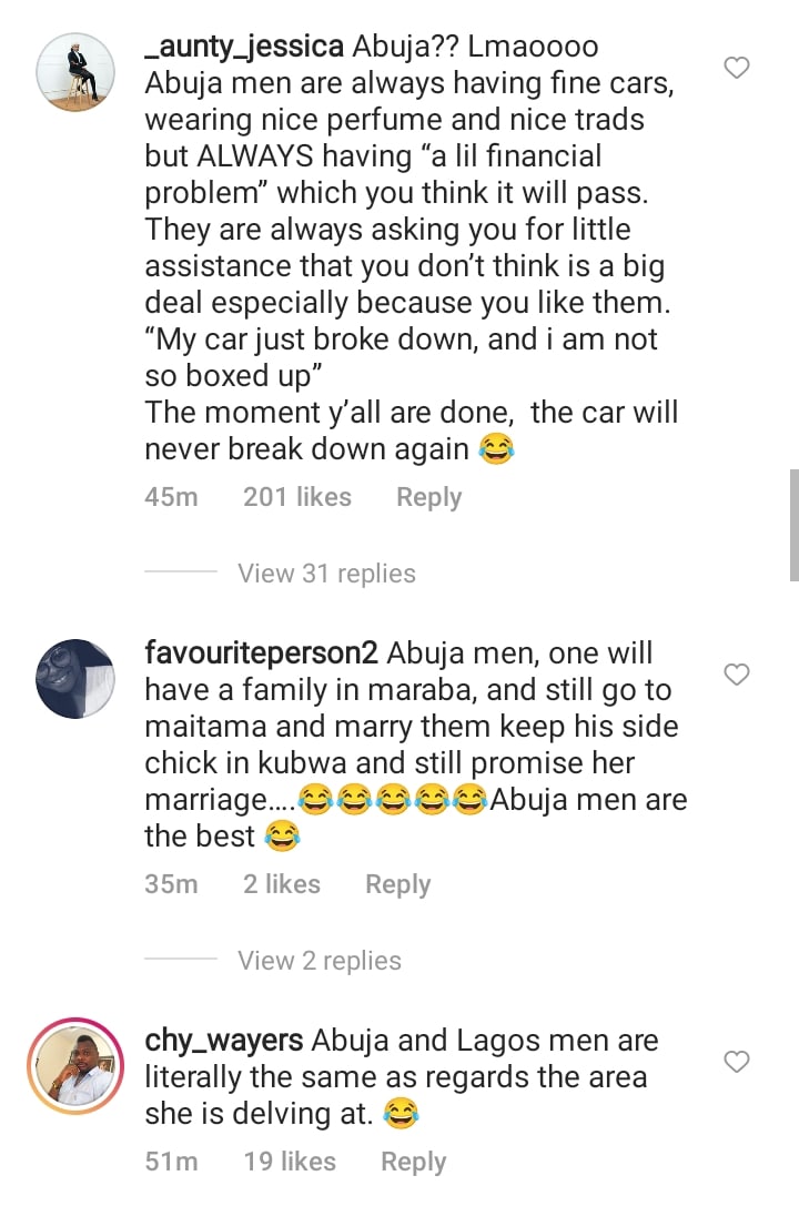 _aunty_jessica wrote: “Abuja?? Lmaoooo Abuja men are always having fine cars, wearing nice perfume and nice trads but ALWAYS having “a lil financial problem” which you think it will pass. They are always asking you for little assistance that you don’t think is a big deal especially because you like them. “My car just broke down, and i am not so boxed up””