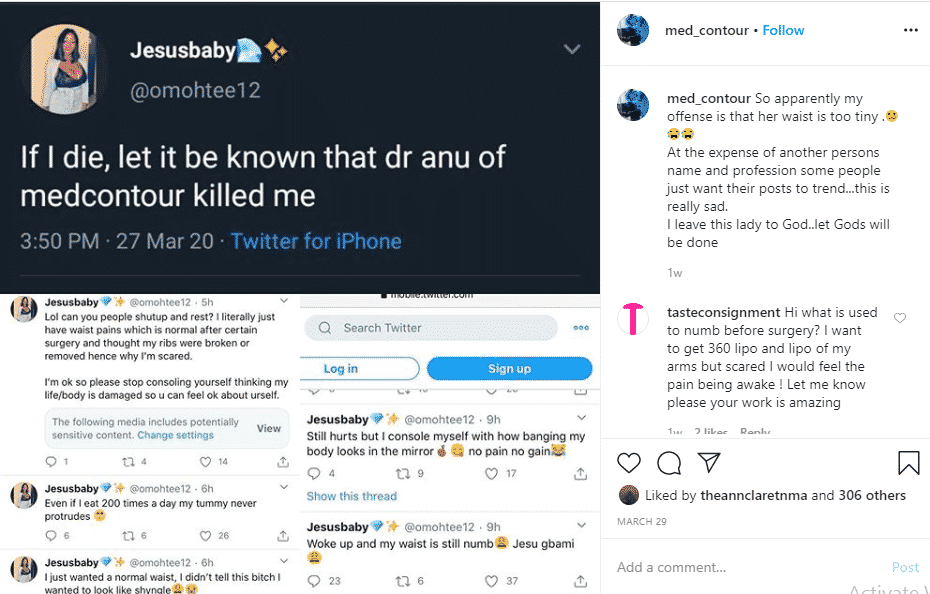 A Nigeria-based plastic surgeon has defended herself after being called out by popular Twitter user, Omohtee who was left battling for her life in a surgery gone wrong.