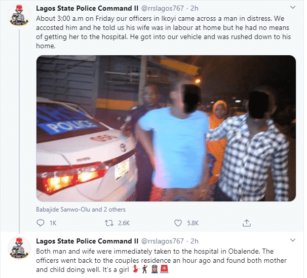 “About 3:00 a.m on Friday our officers in Ikoyi came across a man in distress. We accosted him and he told us his wife was in labour at home but he had no means of getting her to the hospital. He got into our vehicle and was rushed down to his home.