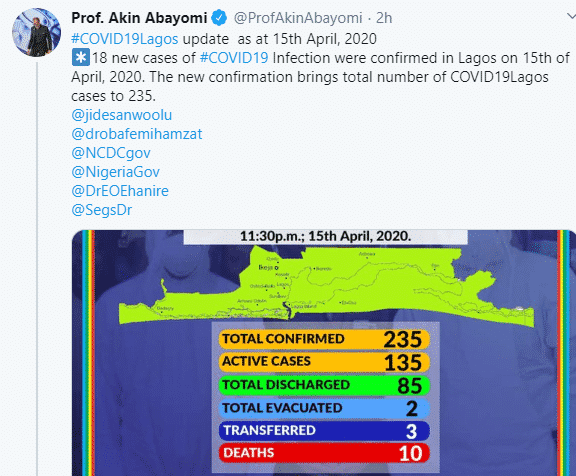 “Update as at 15th April, 2020. 18 new cases of #COVID19 Infection were confirmed in Lagos on 15th of April, 2020. The new confirmation brings a total number of COVID19Lagos cases to 235.