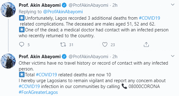 Total #COVID19 related deaths are now 10 I hereby urge Lagosians to remain vigilant and report any concern about #COVID19 infection in our communities by calling 08000CORONA #ForAGreaterLagos.” he wrote