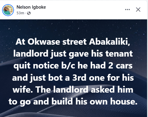 “At Okwase street Abakaliki, landlord just gave his tenant quit notice b/c he had 2 cars and just bot a 3rd one for his wife. The landlord asked him to go and build his own house,” he wrote on Monday.