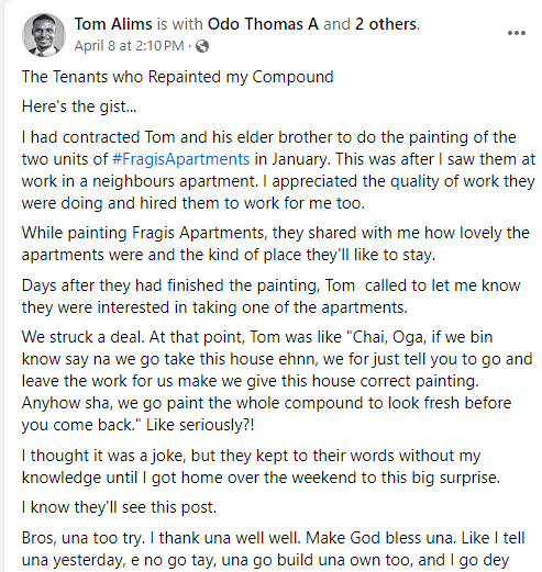 We struck a deal. At that point, Tom was like “Chai, Oga, if we bin know say na we go take this house ehnn, we for just tell you to go and leave the work for us make we give this house correct painting. Anyhow sha, we go paint the whole compound to look fresh before you come back.” Like seriously?!