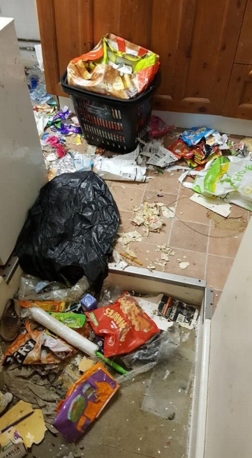 In the kitchen, the tenants had left so many plastic carrier bags, crushed boxes, binbags and empty food containers. The trash completely covered the kitchen floor.