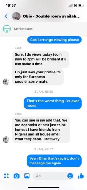 In a screenshot of a chat shared, the landlord told the Gambian student that her house is only for Europeans.