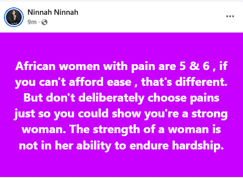 In a series of posts sighted on her Facebook page, the lawyer lambasted ‘African women‘ for always wanting to go through pain just to prove they are strong women,