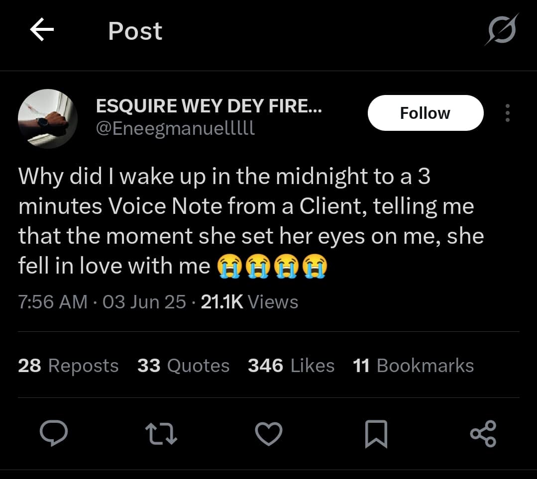 The incident was shared via a post on X (formerly Twitter) by the lawyer, @Eneegmanuelllll, who revealed that he woke up at 3 a.m. to a three-minute voice note from a female client.