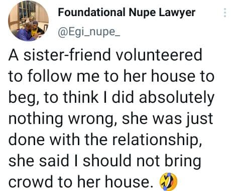 “A sister-friend volunteered to follow me to her house to beg, to think I did absolutely nothing wrong, she was just done with the relationship, she said I should not bring the crowd to her house.”