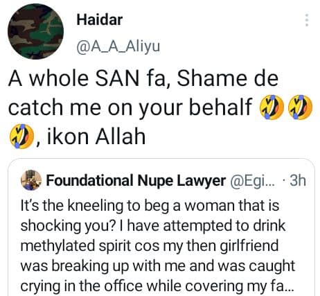 “It’s the kneeling to beg a woman that is shocking you? I have attempted to drink methylated spirit cos my then-girlfriend was breaking up with me and was caught crying in the office while covering my face with a newspaper. I think I just finished 200level that year,”