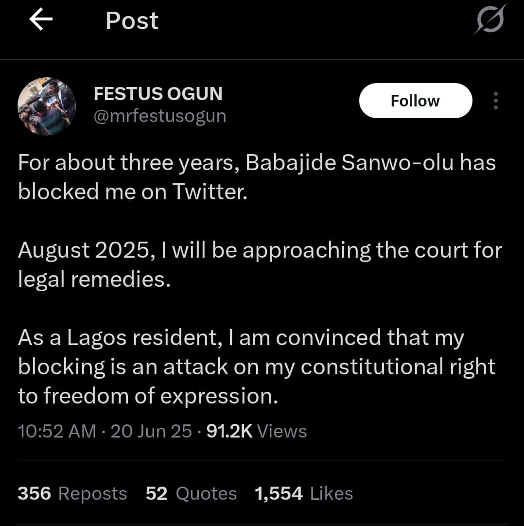 A Nigerian lawyer, Festus Ogun, has declared his intention to file a lawsuit against the Governor of Lagos State, Babajide Sanwo-Olu, for blocking him on X (formerly Twitter).