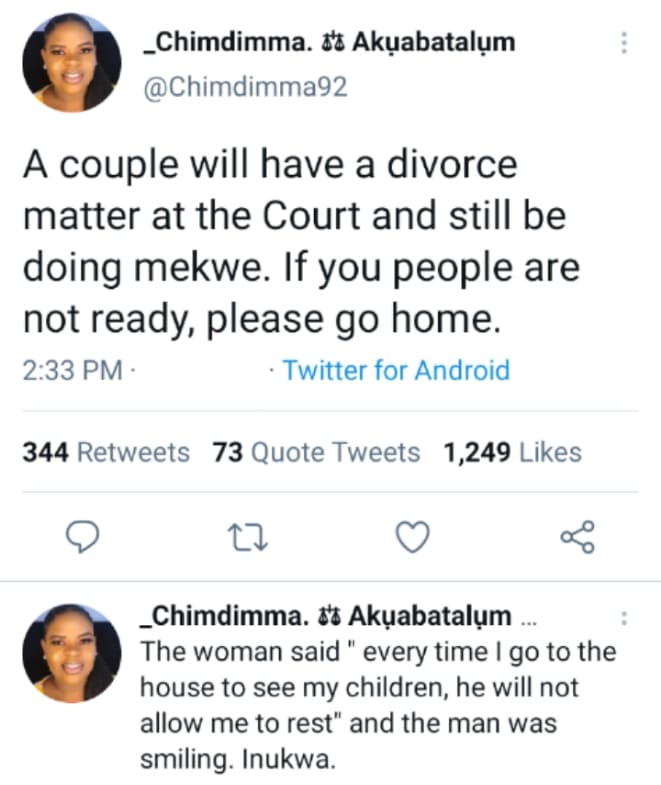 Chidimma revealed via Twitter how the woman would always come to court to speak about their intimate exploits at home while still seeking a divorce.