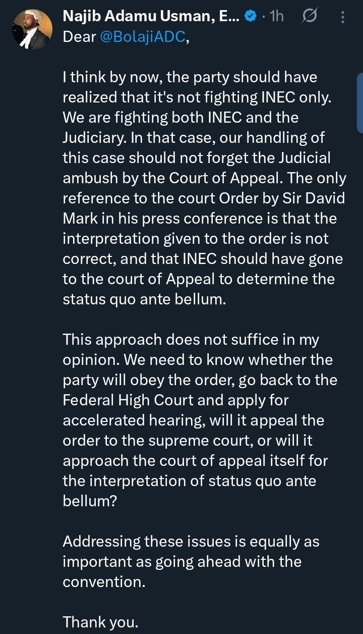 “Dear @BolajiADC, I think by now, the party should have realised that it’s not fighting INEC only. We are fighting both INEC and the Judiciary,” the lawyer stated.