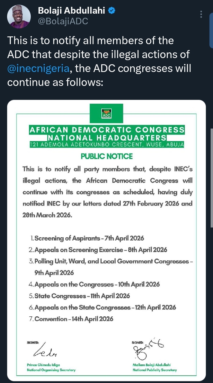 Lawyer warns as ADC announces dates for congresses amid INEC decision