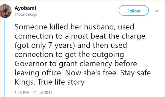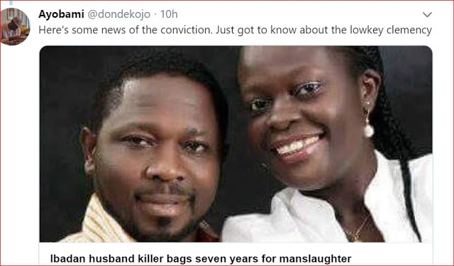 Recall that Yewande, a lawyer was convicted in November 2017, after being found guilty of killing her husband with a knife following a disagreement on February 2, 2016, at their residence in Akobo area of Ibadan. She had only served 2 years out of her 7 year prison sentence before being granted clemency by Governor Ajimobi, allegedly facilitated by her ‘well connected family’.