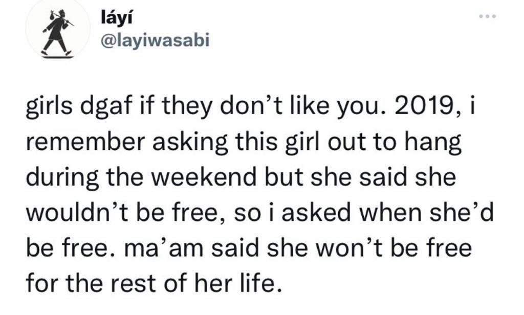“girls dgaf if they don’t like you. 2019, i remember asking this girl out to hang during the weekend but she said she wouldn’t be free, so i asked when she’d be free. ma’am said she won’t be free for the rest of her life.”, he tweeted.
