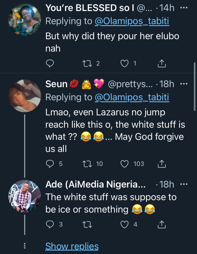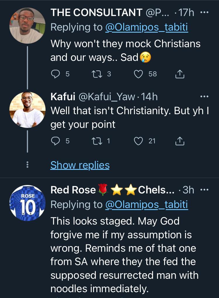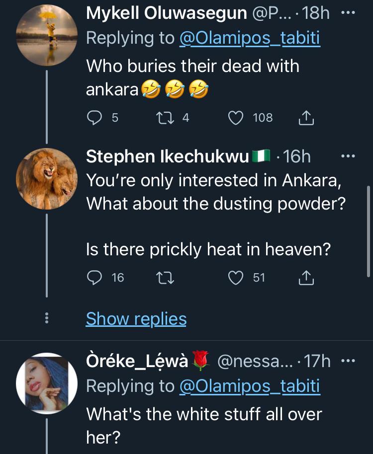 This supposed miracle however triggered reactions online as some users called out the wonder as fake while questioning the excessive powder on the woman’s face and why she was buried in ankara outfit.